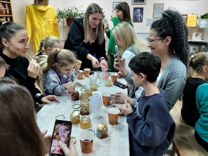 После познавательного путешествия пришёл черёд самого вкусного этапа – дегустации. Гостям предложили разнообразные сорта мёда из ассортимента музея, а также ароматный травяной чай, который идеально дополнил медовые угощения.